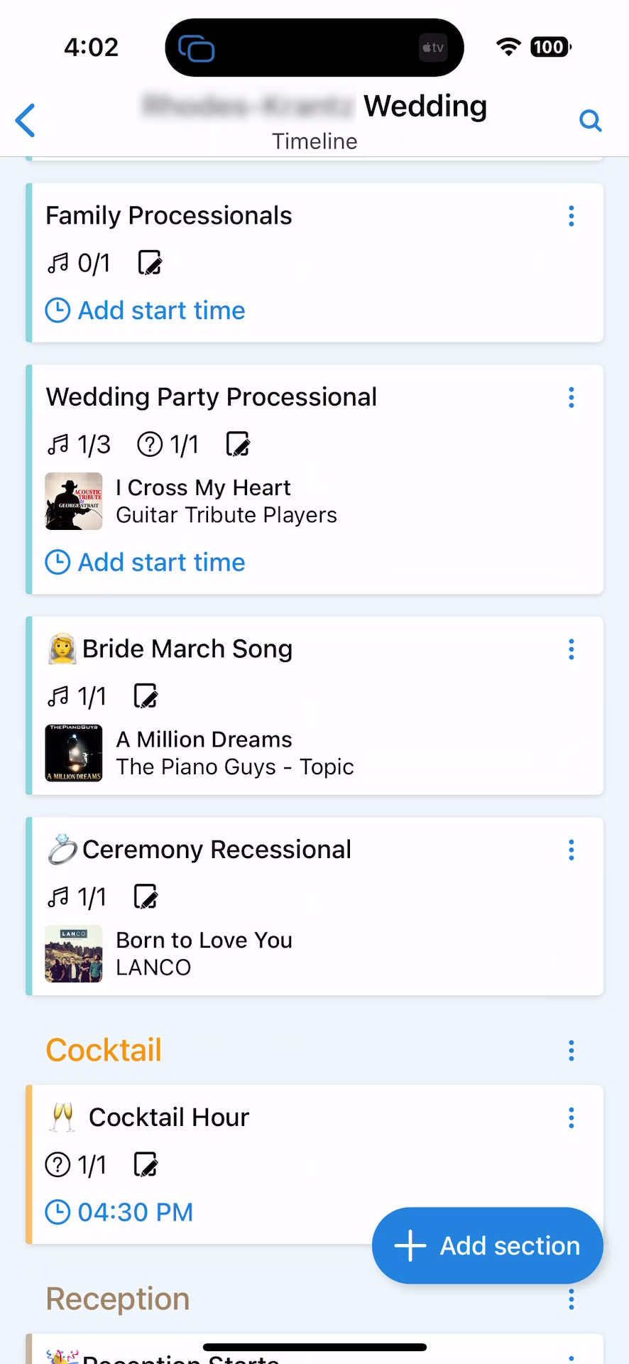 While every event is unique, my clients find it helpful to not have to start from scratch when it comes to planning what traditions and events they want included during their celebration. Compiling all of these in one timeline document with corresponding musical preferences, and desired announcements, helps me create the atmosphere you are looking ... and to keep things on track throughout your day.